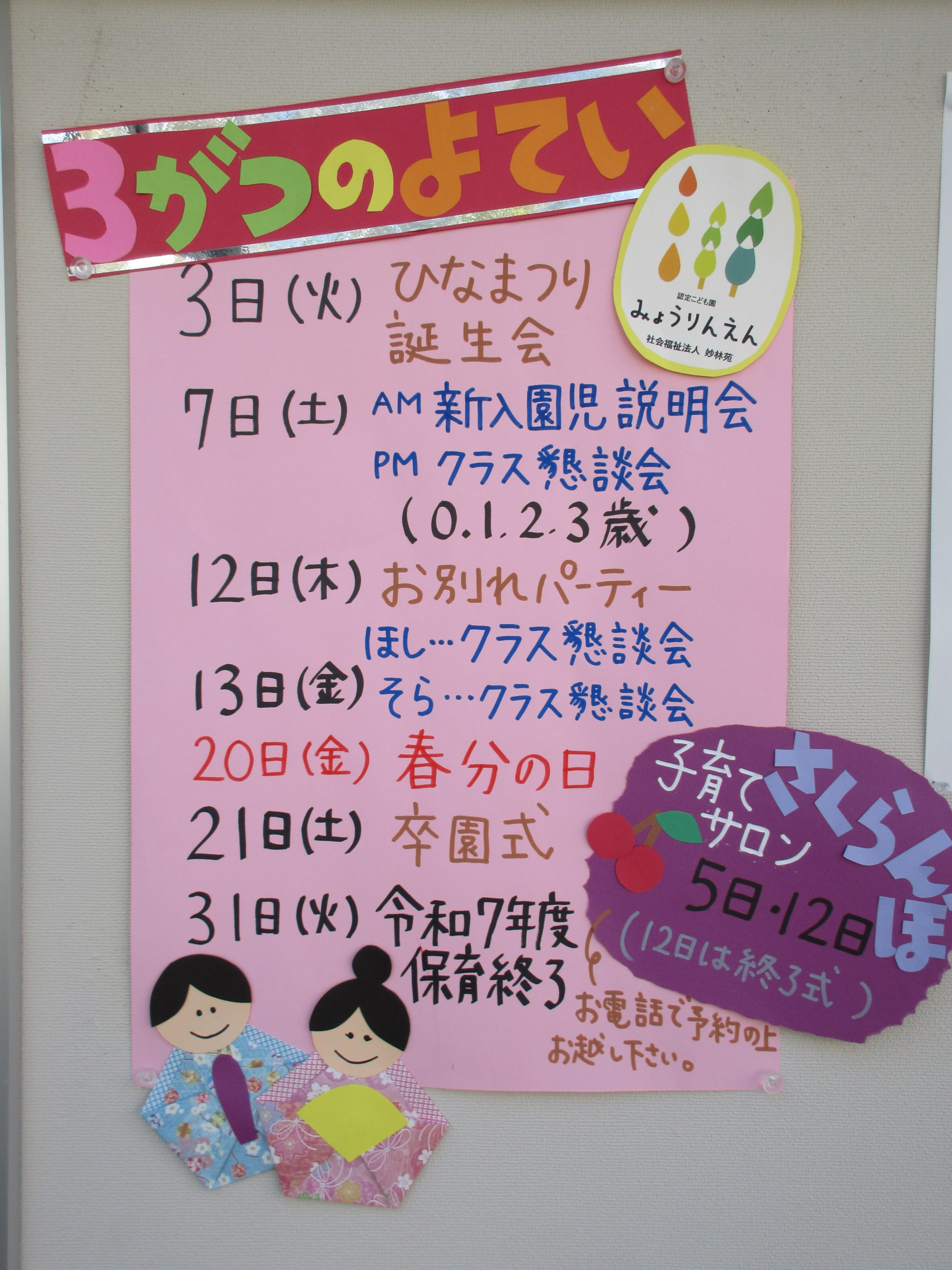 令和7年度3月の予定 公開済み: 2026年3月7日更新: 2026年3月7日作成者: myourinenカテゴリー: 園からのお知らせ 関連記事 まちのアトリエ㉖2022.5.2 まちのアトリエ㉖2022.5.2 公開済み: 2022年5月6日更新: 2022年5月6日作成者: myourinenカテゴリー: 園からのお知らせ まちのアトリエ⑩2025.1.1 まちのアトリエ⑩2025.1.1 公開済み: 2025年1月9日更新: 2025年1月9日作成者: myourinenカテゴリー: 園からのお知らせ 給食だより⑨2022.12.1 給食だより⑨2022.12.1 公開済み: 2022年12月1日更新: 2022年12月1日作成者: myourinenカテゴリー: 園からのお知らせ